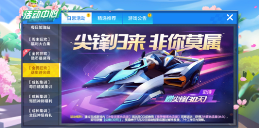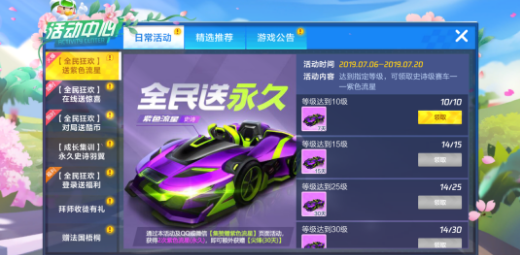 其中集赞获得紫色流星的活动7月9日结束,升级获得紫色流星活动7月20日结束,还没有完成的小伙伴们赶紧去参与一下,总的来说这两个活动还是非常划算的,都有机会得到永久的史诗赛车紫色流星。