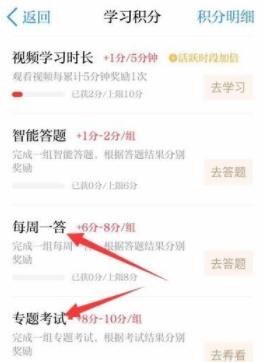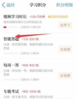 4、智能答题,可以的话每个都去答,不论对错都算是学习,答了就会有积分拿,一直到答到这个项目的上限就可以。