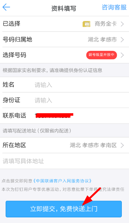 3、接下来去填写好自己的身份信息,选择立即提交功能,就可以等待钉钉卡快递上门了。