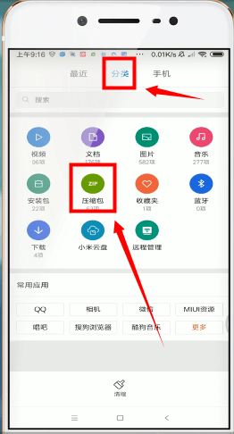 2、之后我们在文件管理里面找到手机压缩文件,在分类选项中点击压缩包。