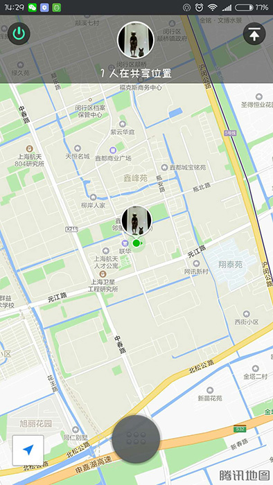 3、然后我们就进入到了共享位置界面,在屏幕中就会显示个人当前的位置,因为共享只有自己一个人,所以当前显示的就是自己的位置。当你发起共享位置的时候,对方的微信对话框中也会显示你发起的“共享位置”,只要他点击进来就可以了。