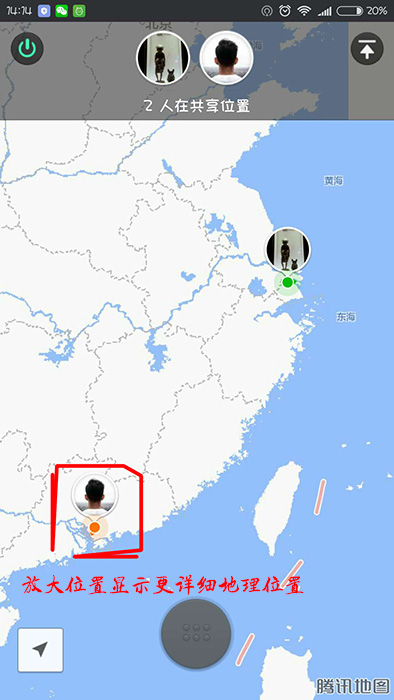4、当有多人进入时,就会显示两人之间的距离与位置,当距离太远的时候,我们可以放大其他人当前的位置,这样就可以详细的看到其的地理位置在哪了。