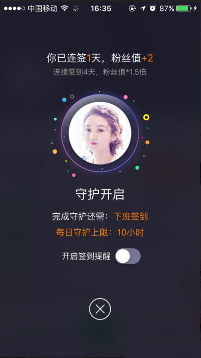 5、返回界面之后,你会在明星右侧看到需要下班签到的地方,但是上下班的签到时间不能瞬间完成,需要间隔10分钟才是可以的。你点击下班签到,系统会提示“守护最低时间是10分钟”;