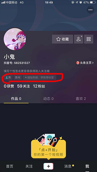 1、打开抖音点击【我】然后选择签名下方的一列点击进入个人资料