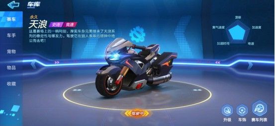 右上角会有一个赛车参数的五芒星展示,从五芒星中可以看到天浪拥有极其优越的集气速度性能,其他性能较为平均。