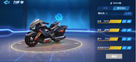 与普通四轮赛车相比,摩托车天生直线性能薄弱。天浪赛车也是如此,拥有极其强大的集齐速度,却在加速时间和加速度上性能损失较重,所以在加点的时候需要弥补加速器与基础速度性能,漂移与集气性能均衡增加。