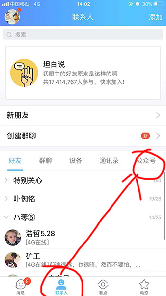 1、打开手机QQ,然后选择底部的【联系人】,然后在选择【公众号】