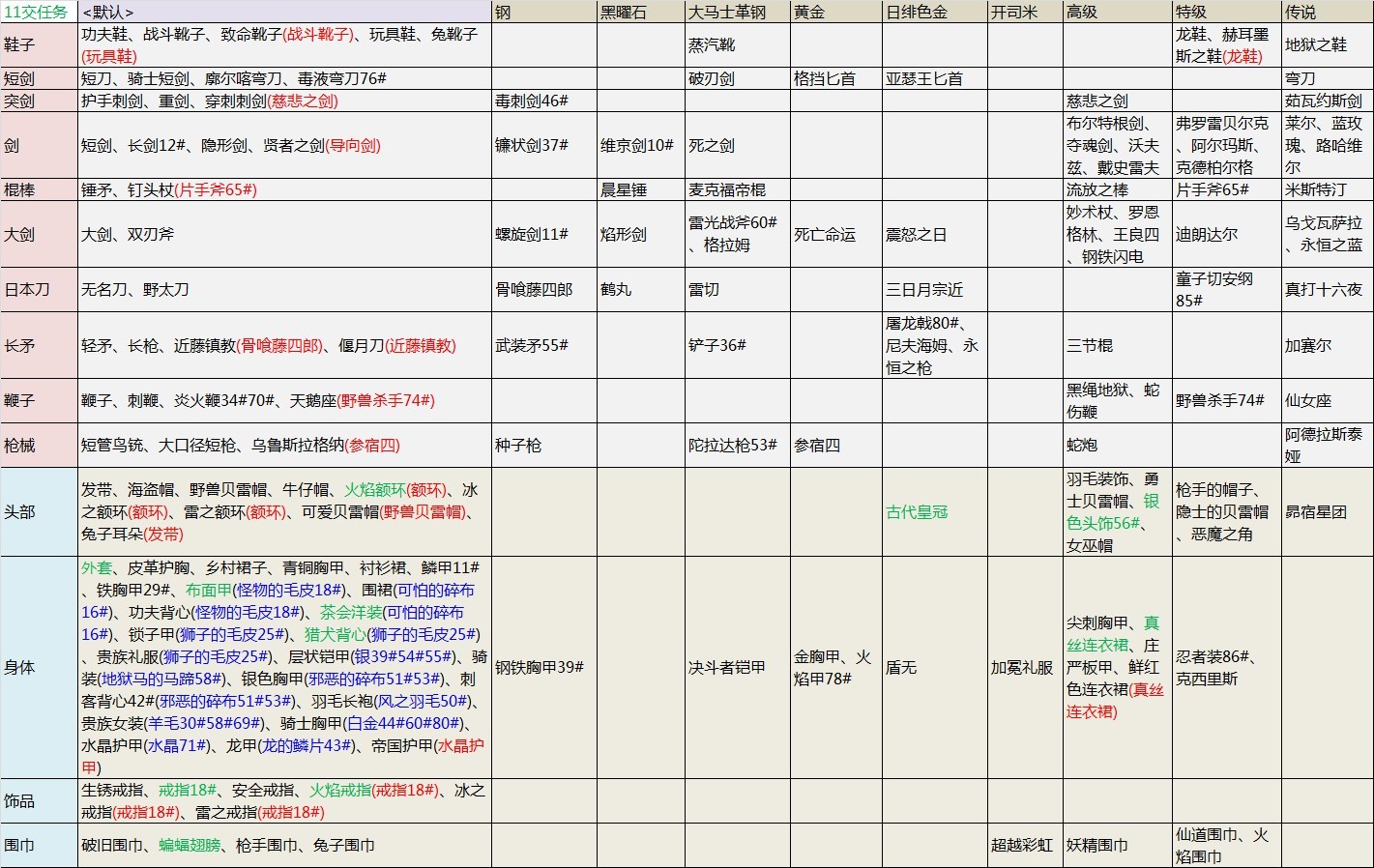 以装备配方为例,同时符合游戏流程以及对应装备的强度梯度的排序应该是:黑曜石→钢→大马士革钢→高级→黄金→特级→日绯色金→传说→开司米。