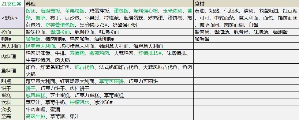 5、表3中绿色高亮的是NPC苏西系列任务索取的料理,同样记得收集并保留。