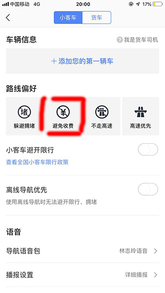 4、进入导航设置之后我们就可以看到路线偏好的栏目,点击避免收费就设置成功了。