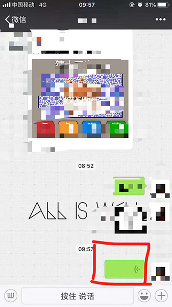 2、找到微信好友发送的语音信息,用手指按住语音信息不动,即会出现功能菜单。由于软件默认是采用扬声器,所以会看到“切换到听筒播放”选项,点击即可切换到听筒模式,如图所示