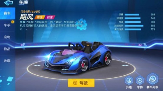 飓风这辆赛车的外形还是非常不错的,我们来看看它的属性如何,以未升级强化时的基础属性为准:漂移688,加速度748,弯道760,加速时间885,集气速度773。