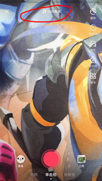 1、进入抖音点击拍摄,然后点击顶部的【选择音乐】;