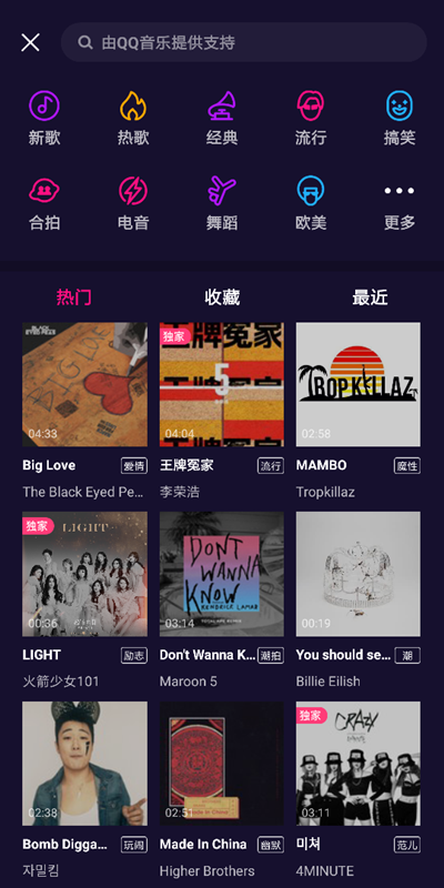 2、然后来到微视音乐选取界面,在这里,歌曲都是被默认添加歌词字幕的,但是非歌曲,像是搞笑、舞蹈、卖萌等的是没有歌词字幕的,因为它们本身就不是歌曲,也就没有字幕,于是,若您选择使用没有字幕的音乐,则最后的视频就是没有歌词字幕的,但是若您选择了默认带有歌词字幕的音乐时,该怎样去除歌词字幕呢,向下看: