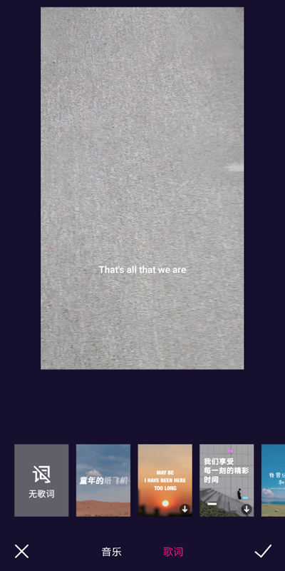 3、这里我们点选一首带有字幕的歌曲,选定后点击右下角的“使用”即可选中,接着可以在视频拍摄界面看到屏幕底部有歌词蹦出