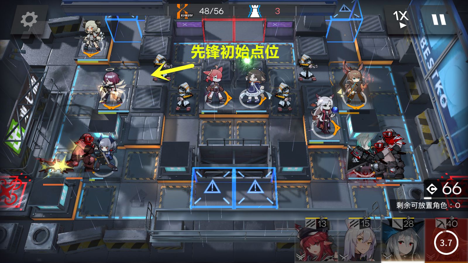 这一关的难点是中后期的“特战术士”与“热战术士组长”(防御C、法抗A),它们有着较高法术防御,如果你像我一样懒得调整阵容,又没有太多爆发型近战干员,推荐中间位置摆放双奶拉仇恨,基本稳过,实在不行还可以丢先锋分担伤害。