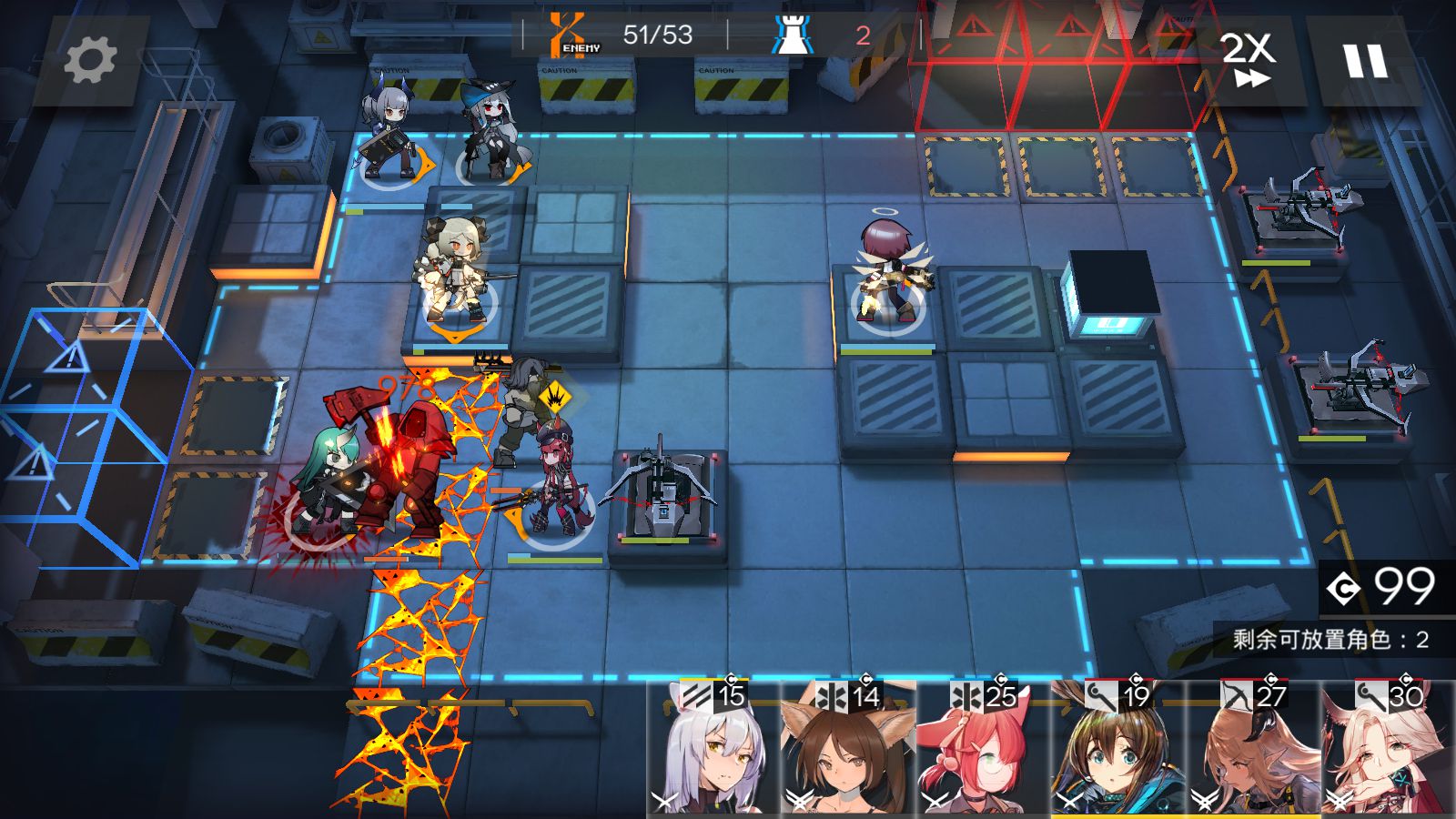 随后上路根据敌人的投放,逐一摆放重装与近卫,基本布局完成。至于能天使,我是让它朝上攻击,借助强大的爆发尽可能多的秒掉滞留的敌人。本关敌人,全部弱物理防御。