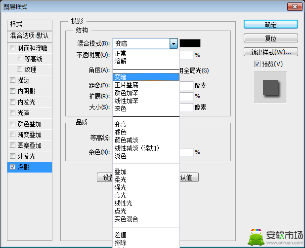 4、在设置模板中点击阴影,勾选。在混合模式中选择任意你需要的效果模式