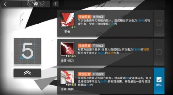 然后我们接着说二技能。二技能第五章,有一关突袭还是非常爽的,就是突袭5-7。可以单人守下,用法也很简单,皮脆的叠技力,皮厚的开技能。而且这个技能也有一点很神奇,可以对空。突袭5-7只要两次就可以解决减攻速的小飞机。