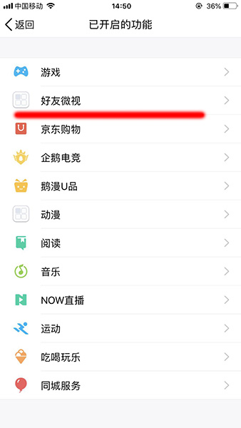 4、这里大家就可以看到“好友微视”功能了,点击进入之后关闭就可以了。
