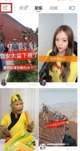 1、首先我们需要打开自己的快手软件,然后点击左上方的【三】图标。