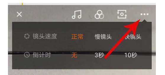 3、返回到视频拍摄界面,注意观察界面上部,点击“...”可以打开镜头速度和倒计时选项,依次点击“...”左侧的3个图标,分别可以打开音乐搜索功能、滤镜特效和反转镜头。