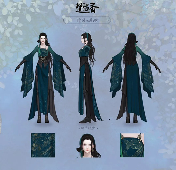 少女款式的遇蛇,则以黑色裙子打底,金色丝线蛇纹刺绣,外衬青色金线刺绣外袍,月光之下,可见星星点点。尤其这两个小小的发揪,看似随意地挽在脑后,更显调皮。