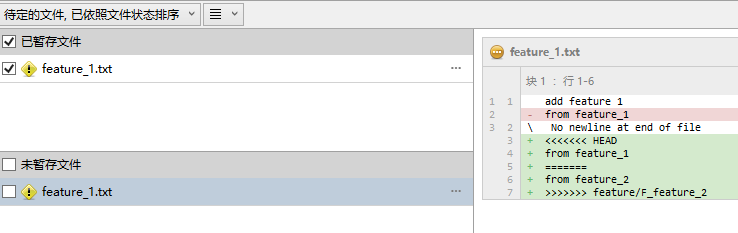 点击close,查看未提交的更改,提示feature_1.txt出现冲突,