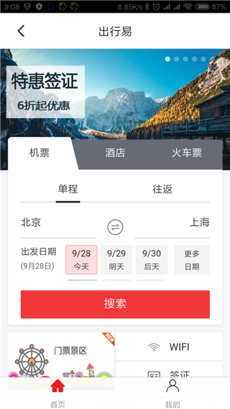 4、在这里你可以看到一个机票,酒店,火车票的搜索订购。