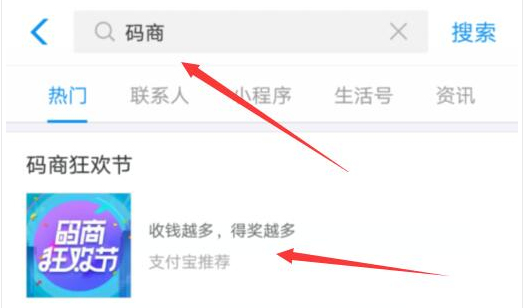 1、首先得确定下自己是否拥有活动的资格,搜索“码商”看下是否出现【码商狂欢节】;