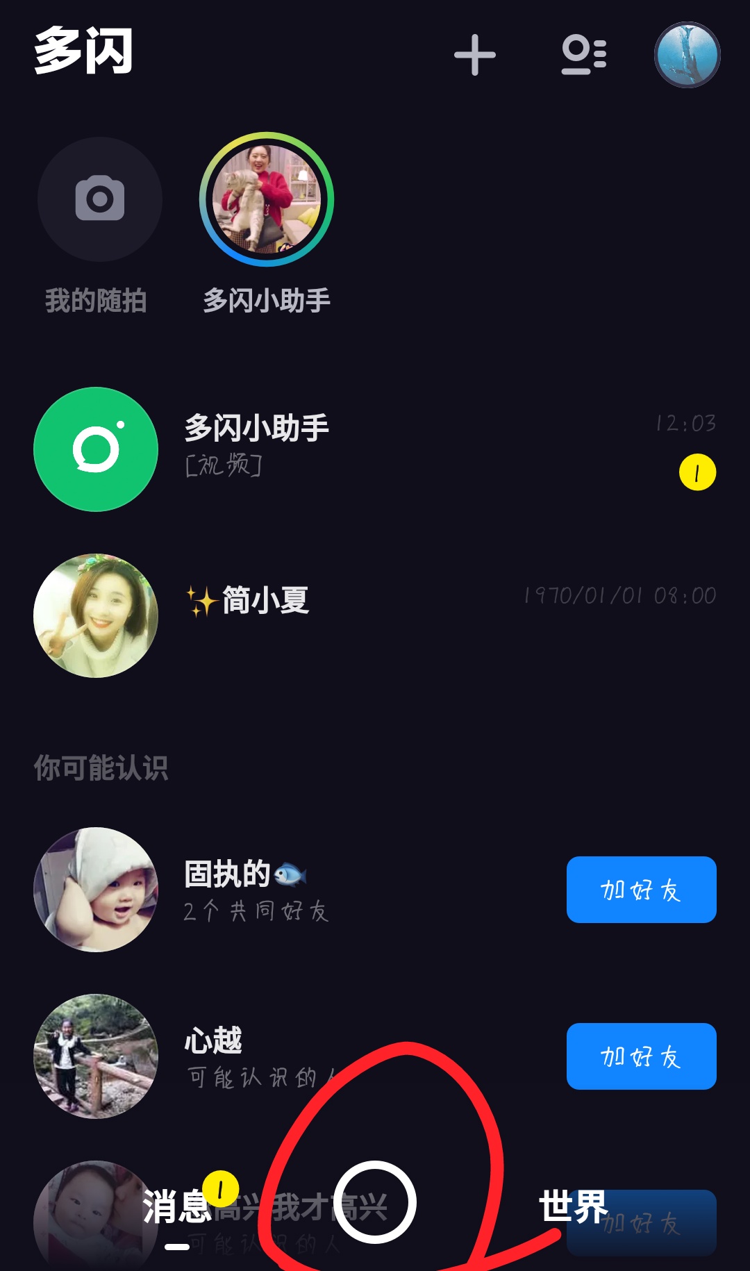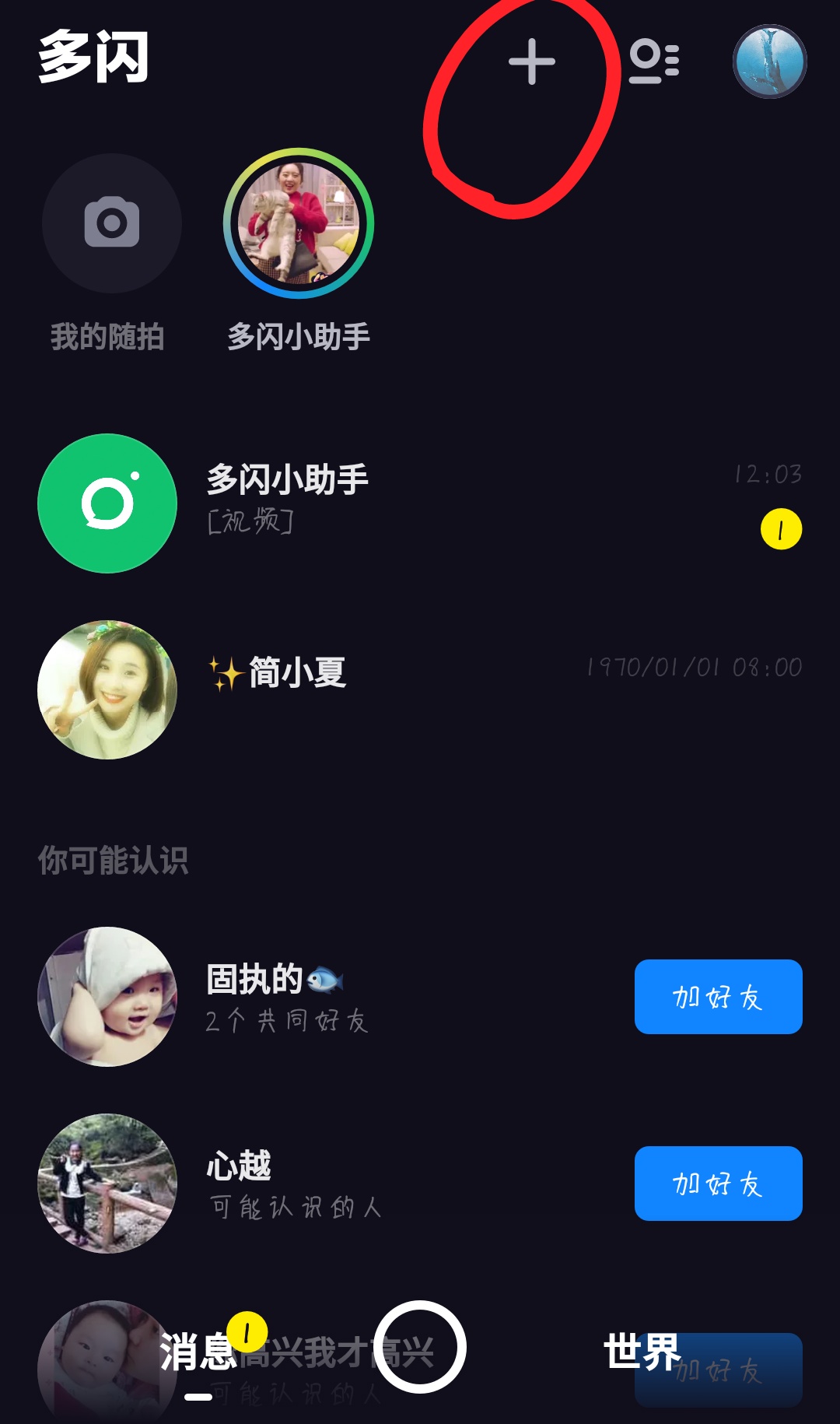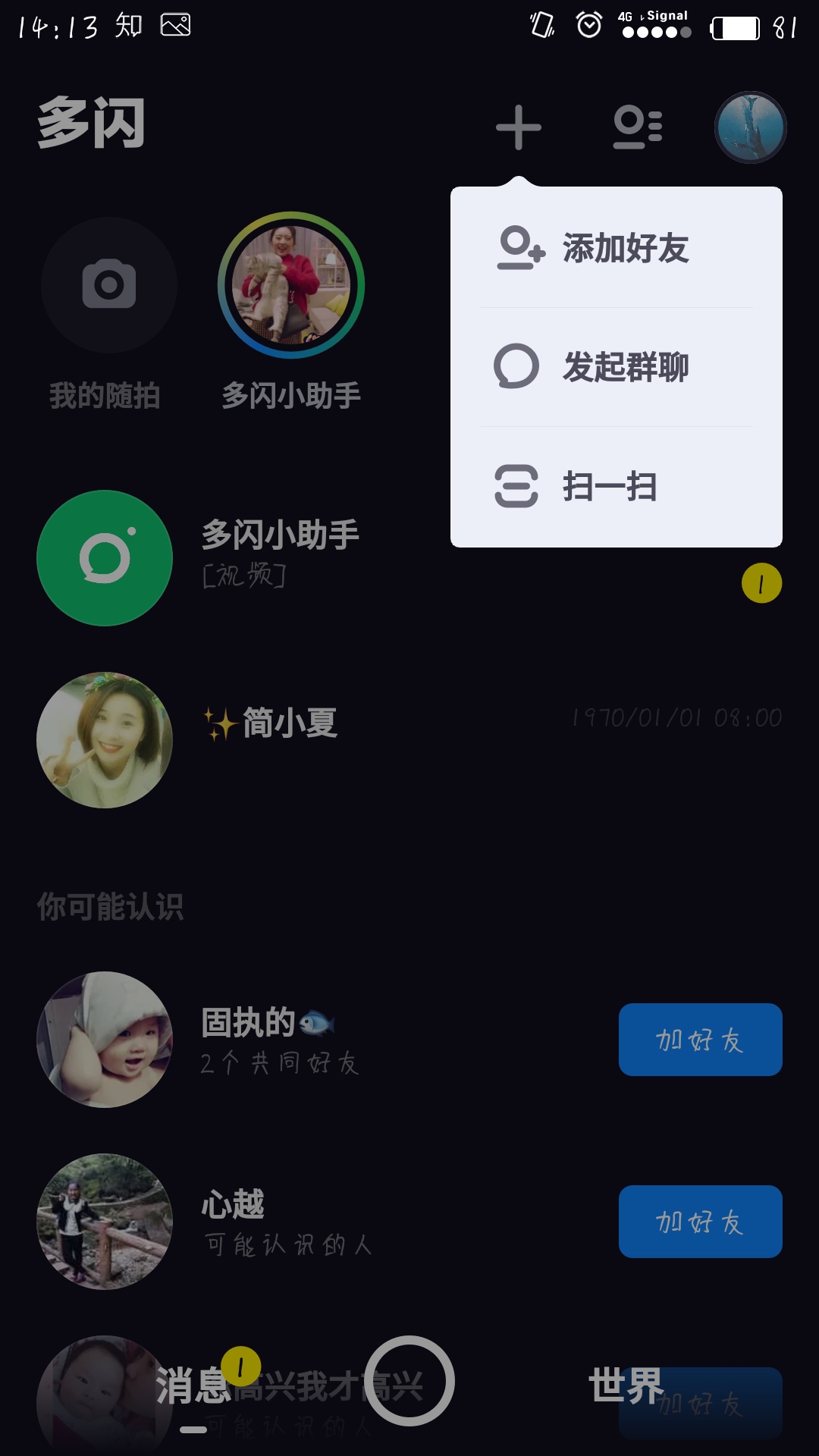 1、打开多闪APP,点击消息页面的“+”号,即可打开“添加好友”、“发起群聊”、“扫一扫”等功能。