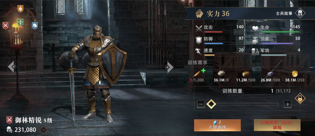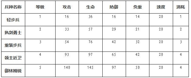 步兵也是分为非常多的种类的,其中包含轻步兵、执剑勇士、重装步兵、领主近卫、御林精锐,在游戏刚开始不久我们需要用粮食、木头、铁来升级步兵,等到了后期的时候需要非常多的铁还有金币才能升级步兵哦。