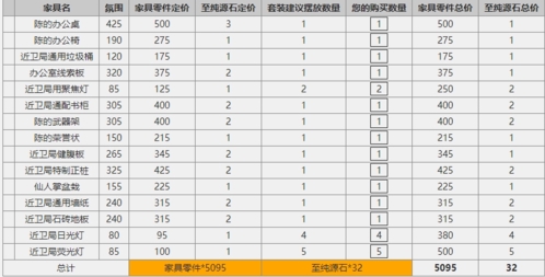 实际上凑齐一套家具,每种只买1件,达到4250氛围值,需要消耗4285家具零件或24至纯源石。