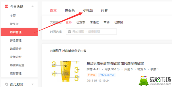 2、登陆之后在“今日头条”栏目下选择【内容管理】,然后选择【小视频】;