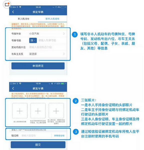 从3月1日开始,通过自助渠道处理非本人车辆的交通违法,必须先实名注册并绑定对应车辆,然后才能处理。小王开着小李的车违停了,受到罚款100元的处罚,驾驶证记3分。以前,小王可带上自己身份证、驾驶证、银行卡、车辆行驶证等证件在自助机上处理。但3月1日以后,小王就不能直接用自己的驾照处理小李车辆的电子眼记分了,需要先实名绑定之后才能处理。那么,如何利用“交管12123”自助绑定非本人机动车呢?下面的流程要看好了!