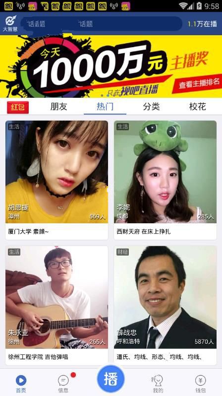 1、在视吧app中我们可以看到众多主播直播,其中包括朋友直播、财经直播、校花直播等等,既有休闲交友、又有金融学习,满足你全方位需求哟;