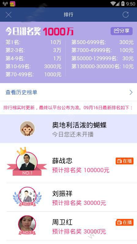 2、在“排行”页面我们可以看到每日主播排名,排行越高获得的收益就越多,即刻加入平台就能赚取丰厚收益哦;