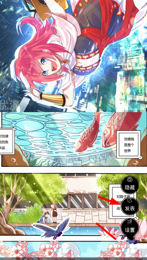 2、接下来点击漫画页面右下角弹幕选项唤醒菜单,就可以从中选择“发表”功能来对弹幕的内容进行编辑了;