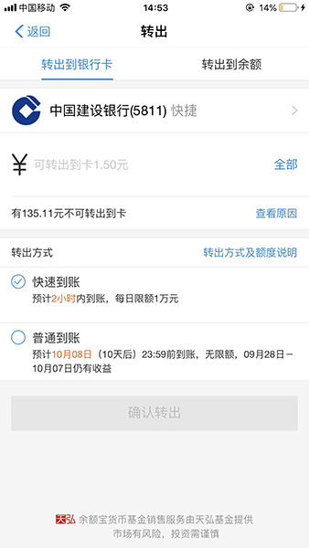 3、转出的时候需要注意的是选项,首先需要将钱转出到支付宝余额中,点击右上方的【转出到余额】