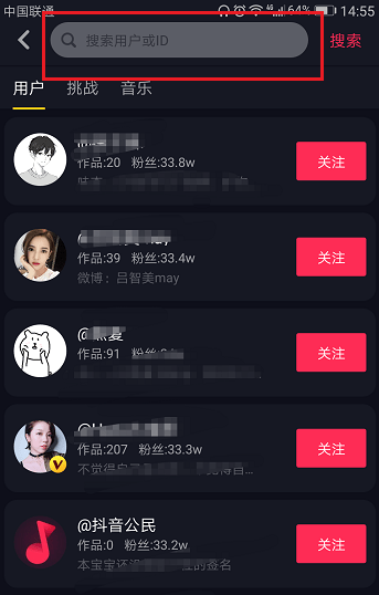 进去搜索查找页面之后,我们看到可以通过用户名和id进行搜索,如下图所示: