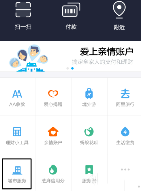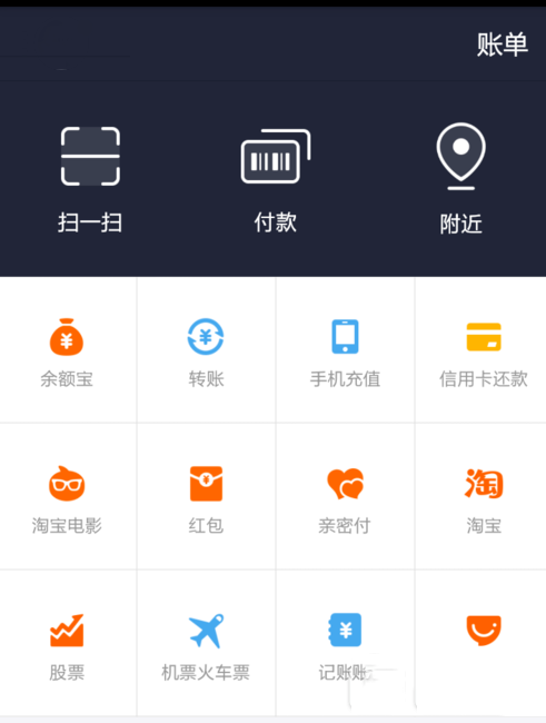 1.首先打开支付宝钱包9.0手机端,然后将屏幕中间的按钮向上滚动,出现更多的选择
