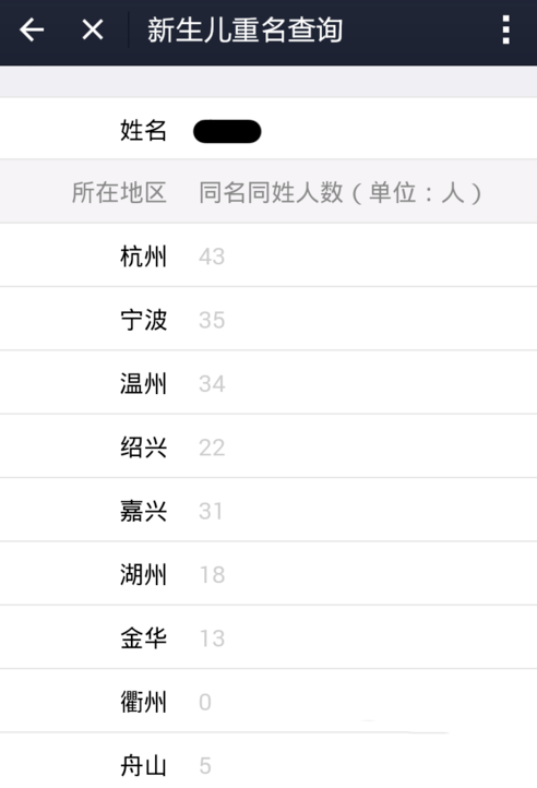 5.查询完毕,系统提示你在全省各地同名的人数量,以便我们取名的时候参考。