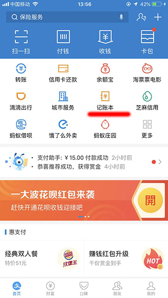 1、进入支付宝之后,在工具栏中就可以找到【记账本】