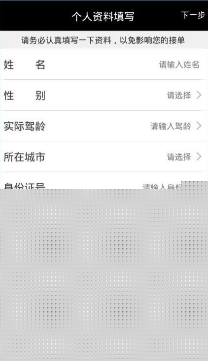 4、写个人资料,包括姓名、性别、实际驾龄、所在城市以及身份证号,同时需要上传身份证和驾驶证的正反面,然后点击下一步;