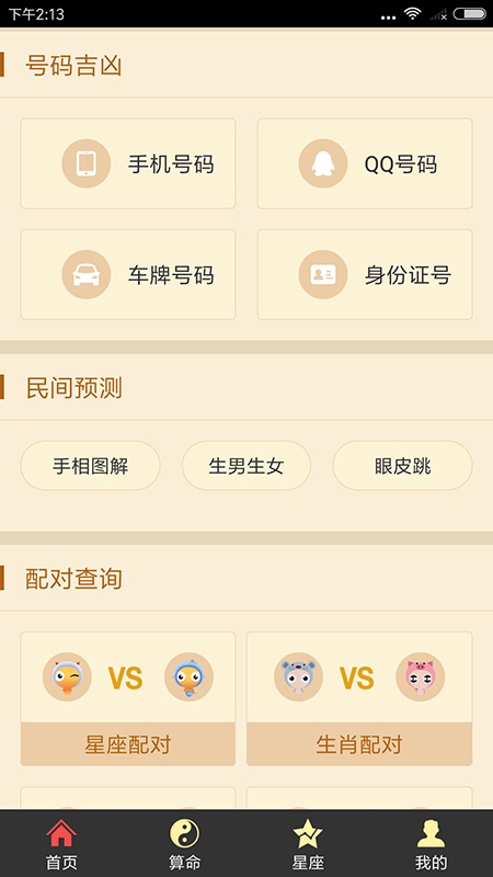 3、同时还可以对号码吉凶查询,包括手机号码、车牌号码、QQ号码、身份证号码),民间预测(手相图解、生男生女、眼皮跳),配对查询(星座配对、生肖配对、血型配对、八字合婚)。