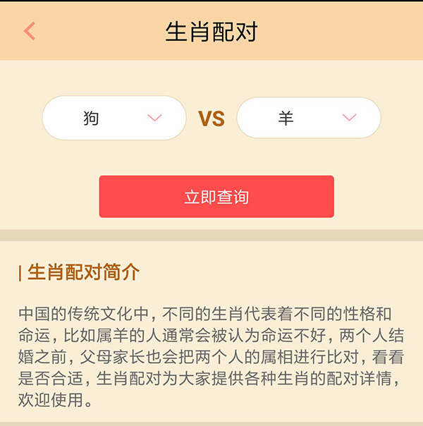 通过生肖来了解两个人的性格和命运,通过属性的对比可以更好的了解两人是否合适。