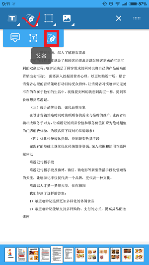 4、就进入编辑的页面,我们长按第二个图标,点击签名按钮,然后轻触你要添加签名的PDF页面中的位置,会出现一个小页面,有两种选择“我的签名”和“一次签名”。我们随意选择一个,点击进去,然后,手写进你的签名,完后之后,点击软件界面右下角的“√”符号,签名就添加完成了。