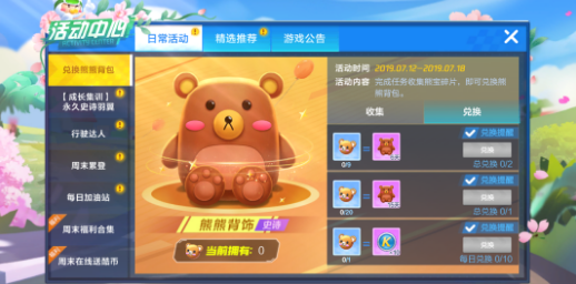 首先这个活动的时间是7月12日到7月18日,差不多有6天的时间,在这六天中玩家可以通过完成这个活动中的任务来兑换熊熊背饰的碎片,集齐碎片后我们就能兑换熊熊背饰啦,这个背饰分为6天和15天,6天的需要9个熊熊背饰碎片,15天需要20个熊熊背饰碎片,总的来说还是非常容易完成的,大家可以点开兑换提醒之后完成任务后系统就会提醒你可以领啦。
