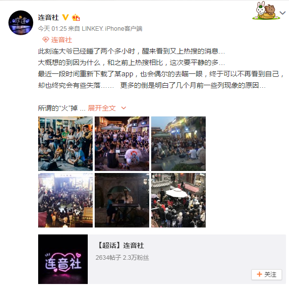 连音社是在抖音走红的,如今在抖音上搜不到连音社,感觉挺惋惜的,毕竟连音社火的时候,有很多人喜欢,但是现在突然退出抖音,真正的原因只有连音社自己知道了,此前刷抖音的时候,总是能刷到连音社,现在刷抖音刷到的就是摩登兄弟,因此有很多网友将二者拿出来作对比,连音社发了微博说了一些话,一起来看看吧!