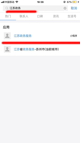 1、打开支付宝直接搜索“江苏政务”,然后就可以看到“江苏政务服务”小程序